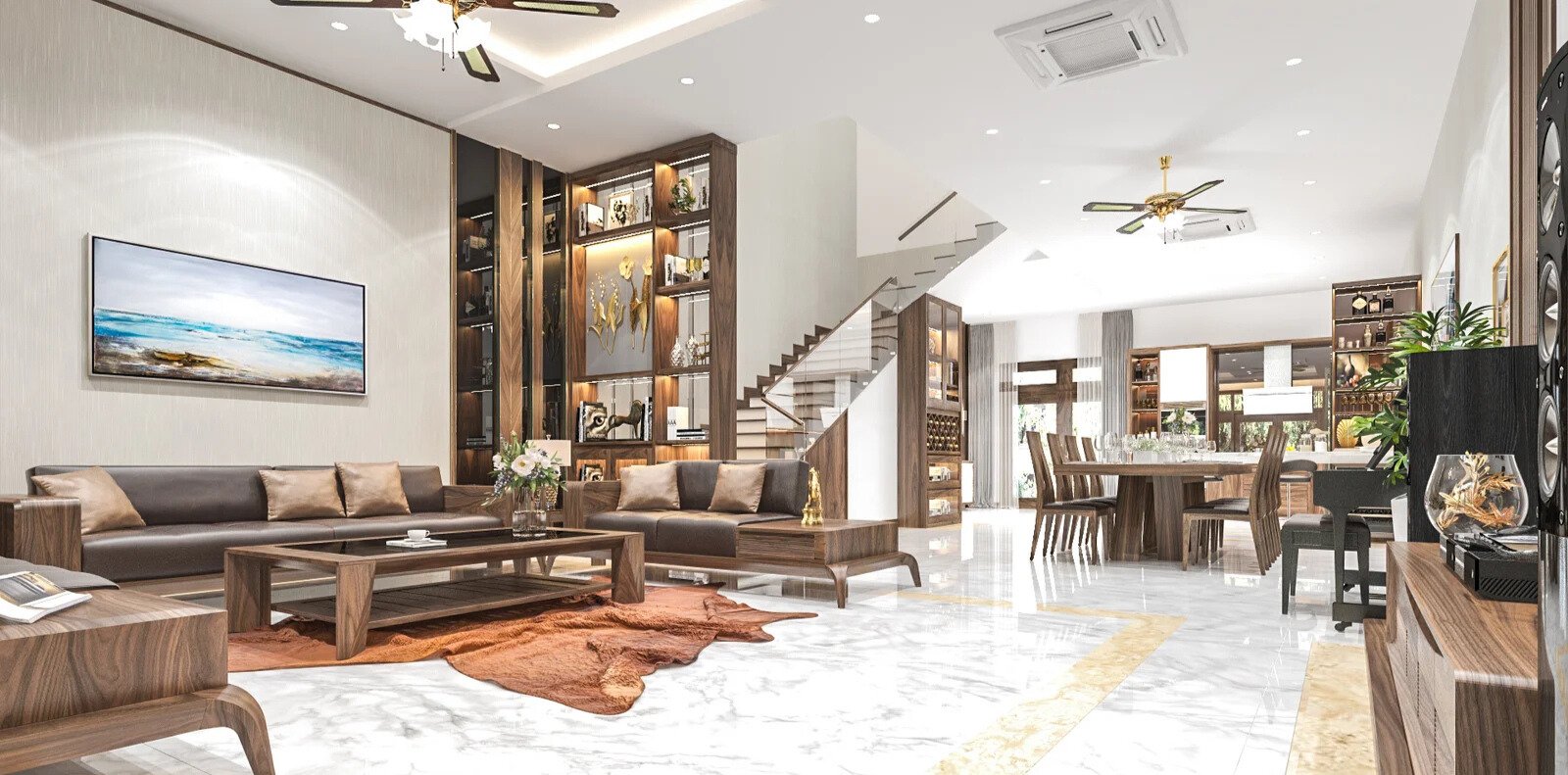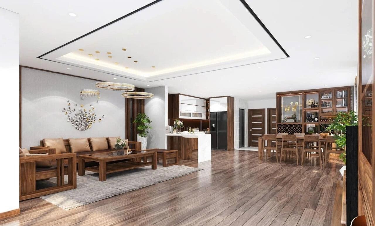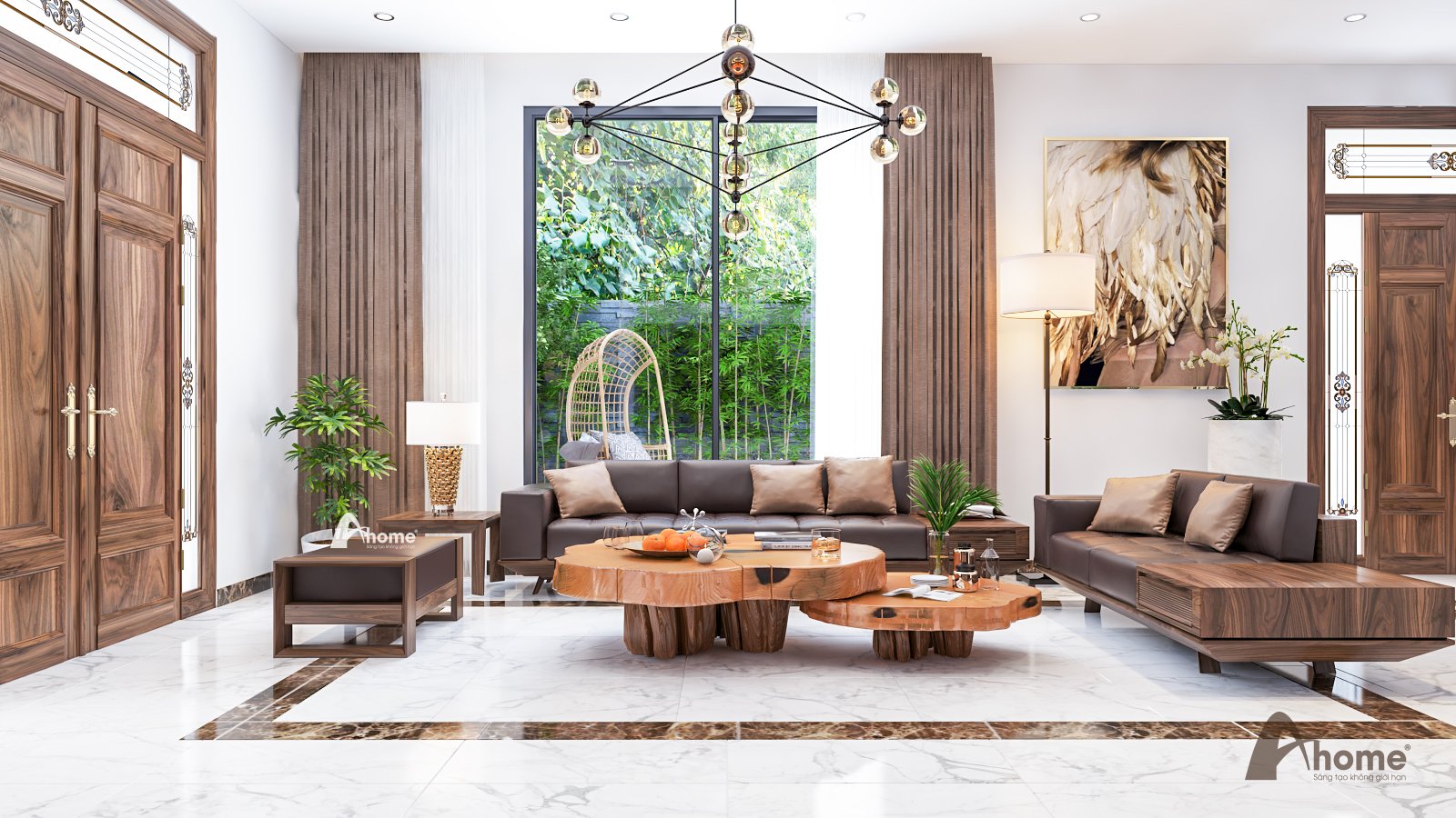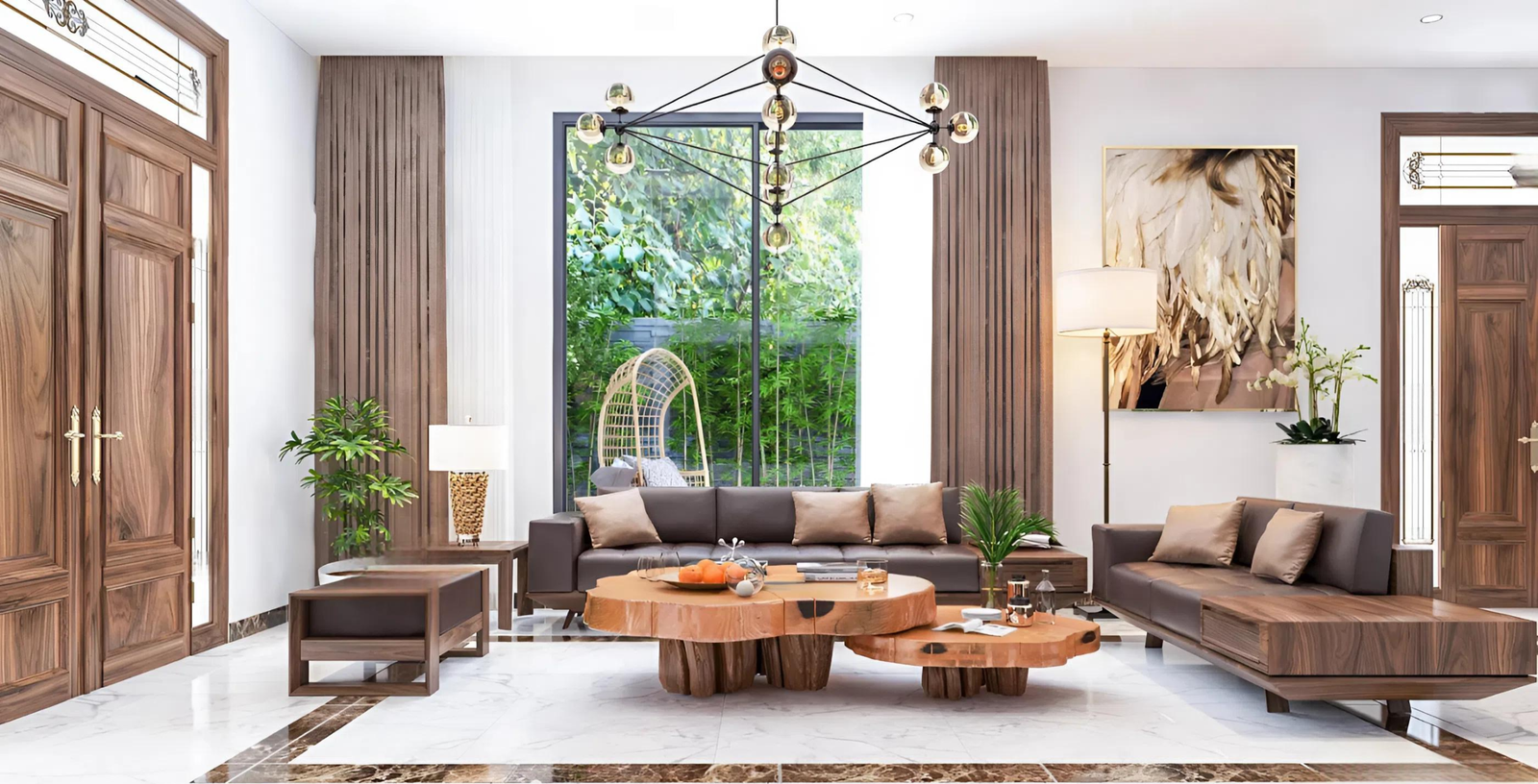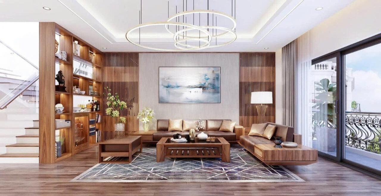 Bàn mặt đá kết hợp chân gỗ óc chó cũng là một ý tưởng khá ấn tượng